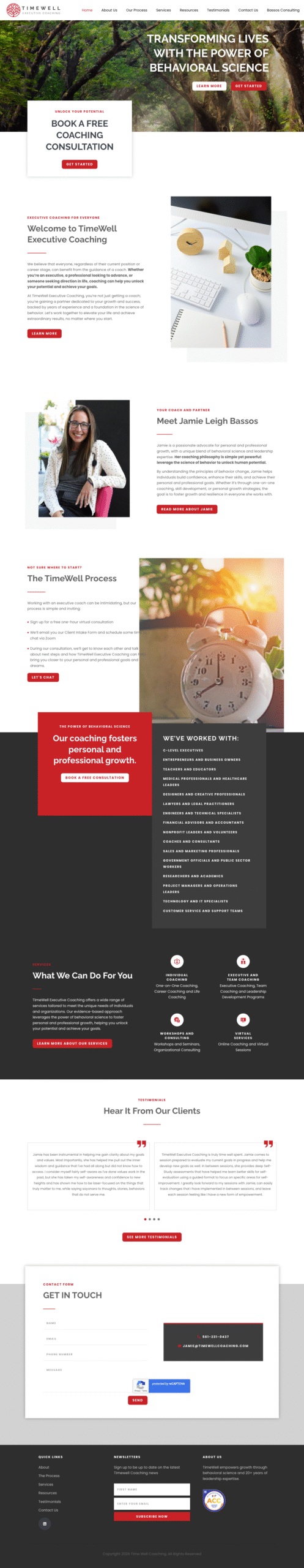 The website successfully communicates the range of services offered and helps users easily find tailored coaching programs. The result is a visually engaging and responsive site that strengthens TimeWell’s online presence and supports increased client bookings